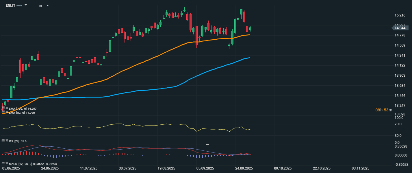 Aktuálně se cena pohybuje na úrovni 14,944 EUR, a to těsně nad klouzavým průměrem EMA 50 (14,790 EUR), který spolu se SMA 100 (14,297 EUR) slouží jako klíčové dynamické podpory. Obě křivky mají rostoucí sklon, což potvrzuje pokračující střednědobý býčí trend.
