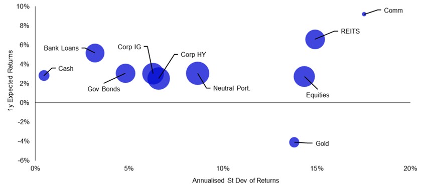 Obrázek 11 – Předpokládaná 12měsíční návratnost versus riziko pro globální aktiva
