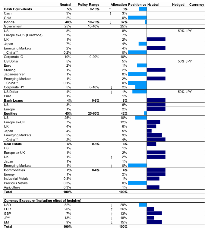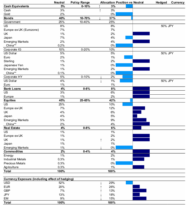 Jedná se o teoretické portfolio, které slouží pouze pro ilustrační účely. Nepředstavuje skutečné portfolio a není doporučením žádné investiční nebo obchodní strategie. **Čína je zahrnuta do alokací rozvíjejících se trhů. Hotovost je rovnoměrně vážená směs USD, EUR, GBP a JPY. Výpočty měnové expozice nezahrnují hotovost. Šipky ukazují směr změny v alokacích. Definice, metodika a prohlášení o vyloučení odpovědnosti jsou uvedeny v přílohách. Zdroj: Invesco Global Market Strategy Office