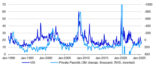 Poznámka: Minulá výkonnost není zárukou budoucích výsledků. Na základě měsíčních údajů od ledna 1990 do srpna 2025. „VIX“ je index CBOE VIX a jedná se o výpočet určený k měření konstantní 30denní očekávané volatility amerického akciového trhu, odvozený z reálných středních kotací opčních kontraktů call a put na index S&P 500® (SPX℠). Údaje o mzdách jsou zkráceny, aby se skryly extrémy zaznamenané během pandemie Covid. Zdroj: CBOE, ICE BofA, Bloomberg, LSEG Datastream a Invesco Global Market Strategy Office