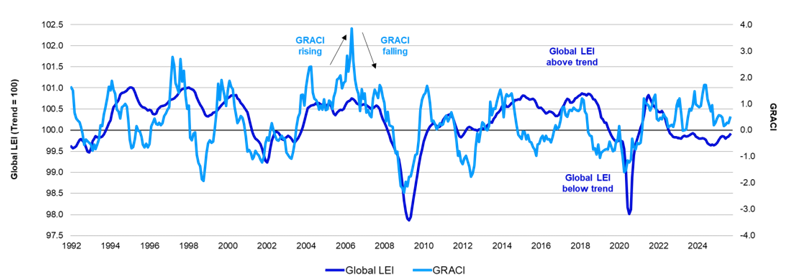 Poznámka: Minulá výkonnost není zárukou budoucích výsledků. Měsíční údaje od ledna 1992 do srpna 2025 (k 29. srpnu 2025). Global LEI (Leading Economic Indicator) i GRACI (Global Risk Appetite Cycle Indicator) jsou proprietární nástroje poskytované společností Invesco Solutions. Global LEI je vážený průměr předních ukazatelů pro 23 zemí (rozvinutých i rozvíjejících se). Hodnota nad (pod) 100 signalizuje růst nad (pod) dlouhodobým průměrem. GRACI měří průměrný přírůstkový výnos získaný za přírůstkovou jednotku rizika podstoupeného na globálních finančních trzích (tj. přírůstkový výnos získaný za přechod od státních dluhopisů k úvěrům, od úvěrů k akciím rozvinutých trhů, od akcií rozvinutých trhů k akciím rozvíjejících se trhů atd.). Vypočítává se pomocí indexů celkového výnosu na úrovni jednotlivých zemí na trzích s pevným výnosem a akciových trzích. Hodnota nad (pod) nulou signalizuje pozitivní (negativní) kompenzaci za riziko podstoupené na globálních kapitálových trzích v nedávné minulosti. Rostoucí index signalizuje zlepšující se sentiment na trhu a naopak. Zdroje: Bloomberg L.P., Macrobond, MSCI, FTSE, JP Morgan a Invesco Solutions