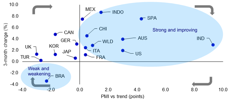 Poznámka: na základě měsíčních údajů do srpna 2025. Údaje PMI poskytuje společnost S&P Global a „PMI vs. trend“ je PMI pro každou zemi/region minus 50. Šipky označují náš názor na směr pohybu v grafu. Zkratky zemí najdete v přílohách. Zdroj: S&P Global, LSEG Datastream a Invesco Global Market Strategy Office