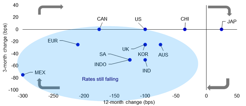„Vzhledem k tomu, že mnoho centrálních bank je v tomto cyklu uvolňování měnové politiky napřed před Fedem, předpokládáme, že mnoho z nich se blíží ke konci uvolňování. Například Švýcarská národní banka již snížila svou cílovou sazbu na nulu a sazba vkladové facility ECB je 2,00 %, což je pokles z maxima 4,00 %. Pokrok ve snižování inflace je v jednotlivých zemích méně zřejmý a obrázek 8 ukazuje, že globální růst peněžní zásoby se zrychlil. To je to, co bychom očekávali, když centrální banky uvolňují měnovou politiku, a mohlo by to naznačovat zrychlení globální ekonomiky (což by podle nás bylo dobré pro cyklická aktiva). Může to však také naznačovat riziko následného zrychlení inflace. Proto se domníváme, že většina ostatních centrálních bank bude v příštích 12 měsících uvolňovat měnovou politiku mnohem méně než Fed, zatímco očekáváme, že BOJ bude pokračovat v postupném zpřísňování (viz prognózy na obrázku 9).“