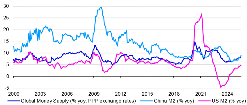 Poznámka: na základě měsíčních údajů od ledna 2020 do července 2025. „Globální peněžní zásoba“ vychází z agregace širokých peněžních agregátů (obvykle M3) pro následující země: Austrálie, Brazílie, Kanada, Chile, Čína, Kolumbie, Kostarika, Česká republika, Dánsko, eurozóna, Maďarsko, Indie, Indonésie, Izrael, Japonsko, Mexiko, Nový Zéland, Norsko, Polsko, Rusko, Jižní Afrika, Jižní Korea, Švédsko, Švýcarsko, Turecko, Spojené království a Spojené státy americké. Agregace vychází z národních peněžních zásob s použitím směnných kurzů parity kupní síly (PPP) pro převod na americké dolary (směnné kurzy PPP jsou kurzy, které vyrovnávají kupní sílu mezi zeměmi a jsou obvykle stabilnější než tržní směnné kurzy). Zdroj: OECD, Oxford Economics, LSEG Datastream a Invesco Global Market Strategy Office