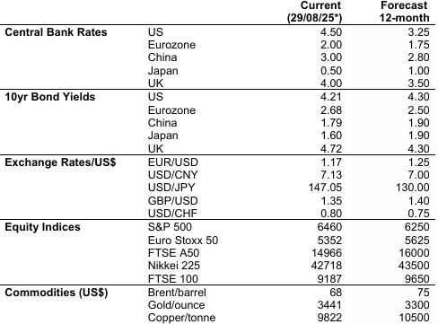 „Fed se chystá připojit k uvolňovací politice. Více než 40 centrálních bank snížilo v průběhu roku 2025 úrokové sazby (některé příklady viz obrázek 7). Fed zaostává, protože od prosince úrokové sazby nesnížil, zatímco ECB (například) uvolnila měnovou politiku již čtyřikrát. Očekáváme však, že Fed uvolní měnovou politiku na svém zasedání 17. září 2025, do konce roku ještě několikrát a v příštích 12 měsících celkem o 125 bazických bodů (Fed Fund Futures naznačoval 150 bazických bodů, stav k 11. září).“