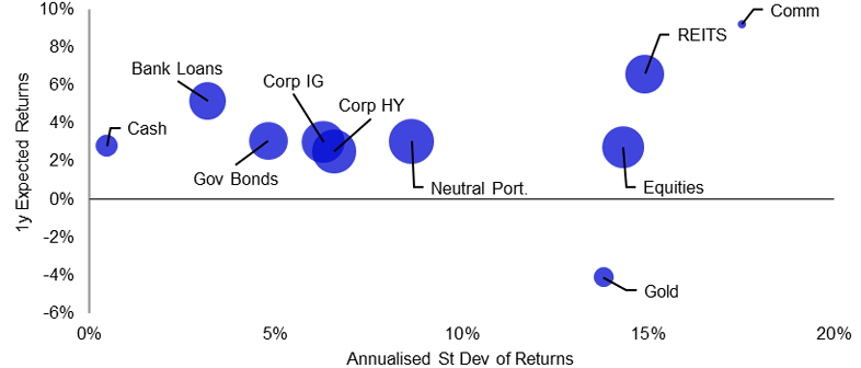 Poznámky: na základě výnosů v místní měně. Výnosy jsou prognózované, ale směrodatná odchylka výnosů je založena na 5letých historických datech. Velikost bublin je úměrná průměrné párové korelaci s jinými aktivy. Hotovost je rovnoměrně vážená směs USD, EUR, GBP a JPY. Váhy neutrálního portfolia („Neutral Port.“) jsou uvedeny v obrázku 3. K 29. srpnu 2025. Neexistuje žádná záruka, že se tyto názory naplní. Definice, metodika a prohlášení o vyloučení odpovědnosti jsou uvedeny v přílohách. Zdroj: ICE BofA, Credit Suisse Indices/UBS, FTSE Russell, MSCI, S&P GSCI, LSEG Datastream a Invesco Global Market Strategy Office