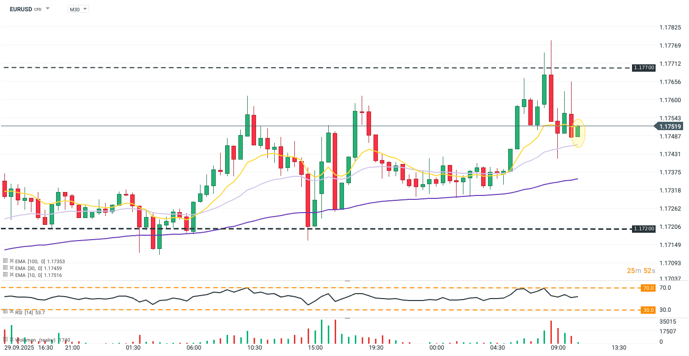 Mírný nárůst inflační dynamiky podporuje konec cyklu uvolňování ECB. EURUSD se aktuálně konsoliduje mezi EMA10 a EMA30 na intervalu M30 (kolem 1,175).