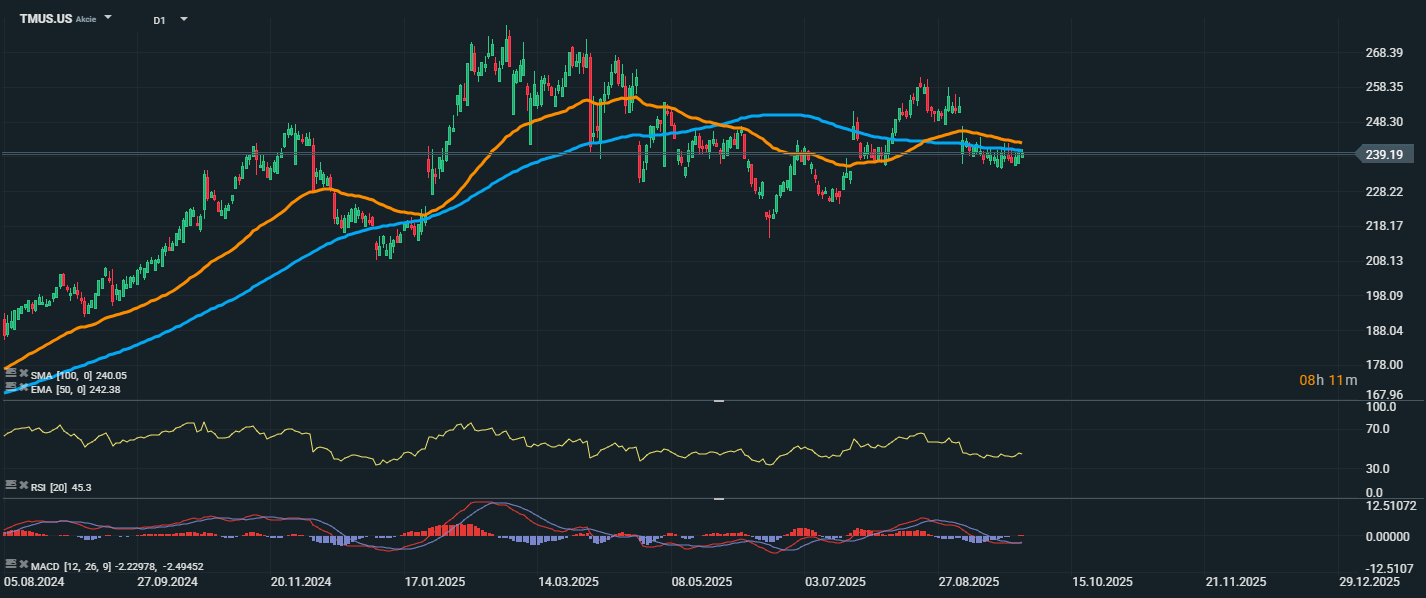 Akcie T-Mobile US se aktuálně obchodují na úrovni 239,19 USD. Cena se pohybuje pod klouzavými průměry EMA 50 (242,38 USD) i SMA 100 (240,05 USD), což ukazuje na krátkodobě slabší technické nastavení. Oba průměry se navíc sbíhají a mohou tvořit rezistenční bariéru. RSI (45,3) se nachází pod neutrální hodnotou 50, což naznačuje převahu prodejců, avšak bez známek přeprodanosti.