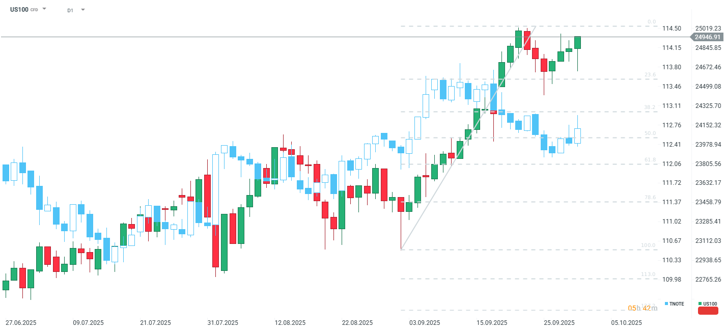 US100 plně vymazal ztráty z asijské seance a nachází se jen 0,3 % od historického vrcholu. Index dnes roste o 0,4 %, blíží se k úrovni 25 000 bodů a smazal pokles, který začal včera večer a trval až do začátku evropské seance. Růst futures na Nasdaq 100 se navíc prudce zrychlil po dnešním otevření Wall Street.