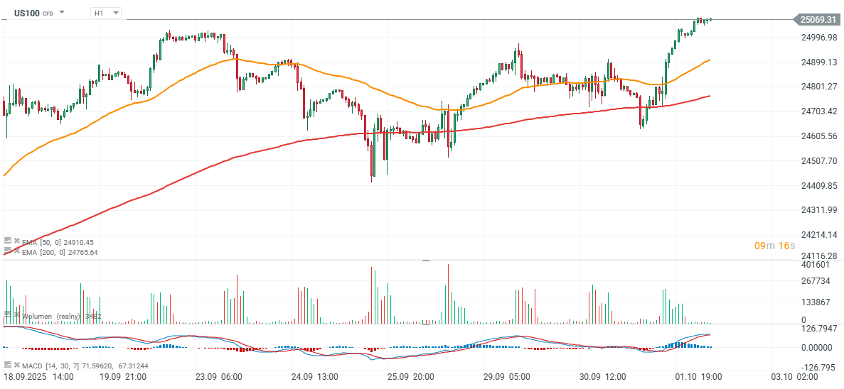 - Rally v Asii se promítla do zlepšení nálady u futures na evropské i americké indexy, přičemž US100 se vyšplhal o 0,25 % k úrovni 25 100 bodů.
