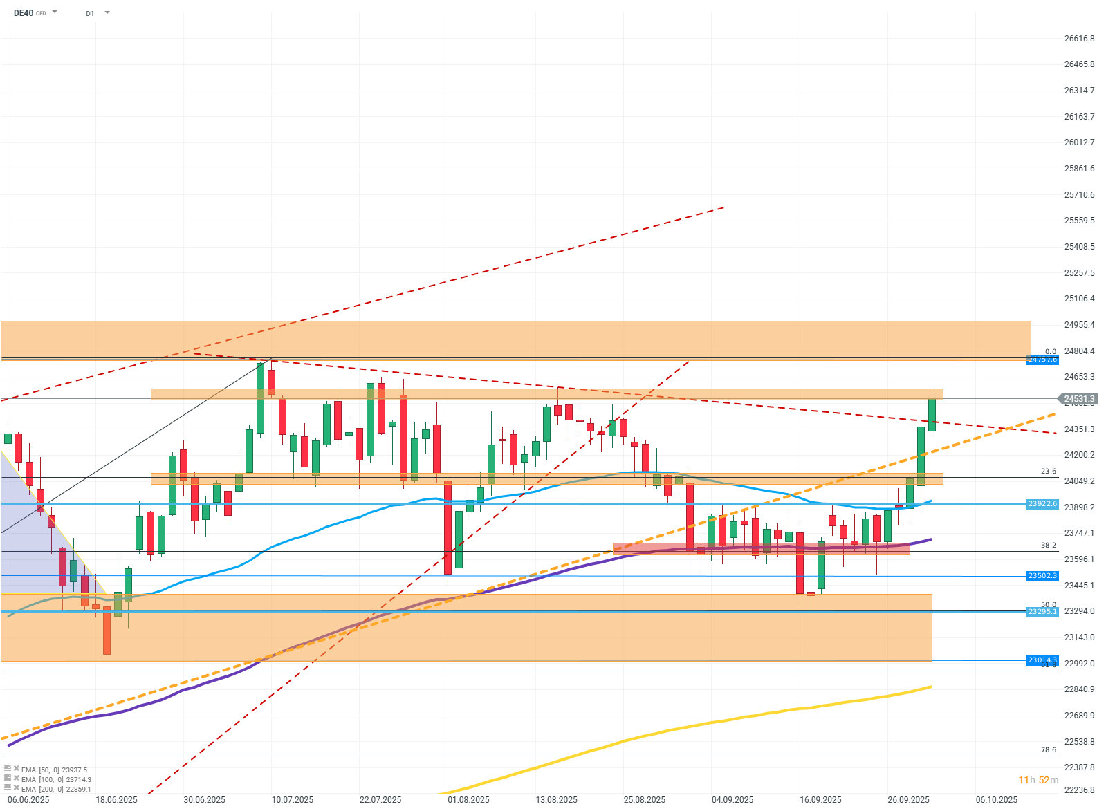 Graf ukazuje, že kupci silně prorazili rezistenční zónu na úrovni FIBO 23,6 a aktuálně jsou zastaveni na poslední zóně podpory oddělující cenu od historického maxima (ATH). Průlom rezistence kolem 24 530 může vést k otestování oblasti ATH, zatímco odražení od rezistence bude s největší pravděpodobností znamenat návrat ke konsolidaci mezi 24 500 a 23 500.