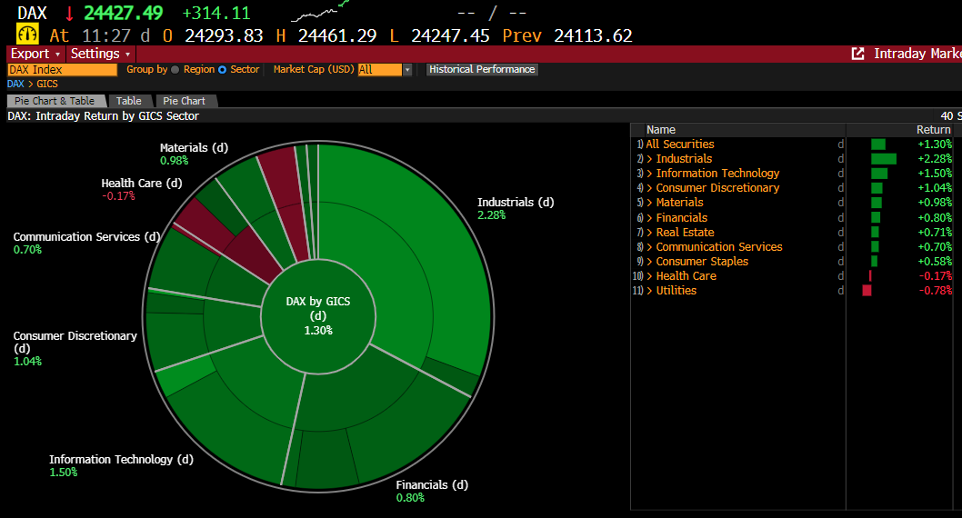 Pozitivní signály z USA ohledně finanční výkonnosti předních technologických společností posilují důvěru investorů v budoucnost IT sektoru. Pozitivní nálada se odráží ve výkonu německého indexu DAX, který aktuálně vzrostl o 0,76 %. Zajímavé je, že i přes mírnou změnu se na růstu zatím podílejí všechny segmenty. Nejsilnější růst zažívá IT sektor, zatím o +1,76 %. Silný nárůst je také zaznamenán v sektoru spotřebního zboží (+0,98 %) a zdravotnictví (+0,85 %). -