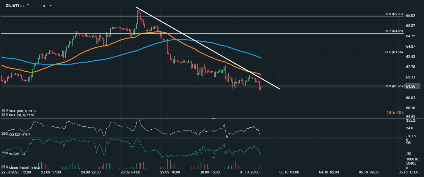 Cena OIL.WTI pokračuje ve výrazném sestupném trendu a aktuálně se obchoduje kolem 61,56 USD za barel. Klesající trendová linie zůstává nedotčena a potvrzuje pokračující tlak prodejců. Klouzavé průměry EMA 50 (62,30 USD) i SMA 100 (63,35 USD) byly jasně proraženy směrem dolů, což je silný medvědí signál a značí převahu prodejců na trhu. CCI dosahuje extrémní přeprodanosti na hodnotě -173,7, což naznačuje, že cena je výrazně pod tlakem, ale také se může blížit krátkodobému obratu nebo korekci. Williams %R se nachází na hodnotě -73, tedy hluboko v pásmu přeprodanosti.