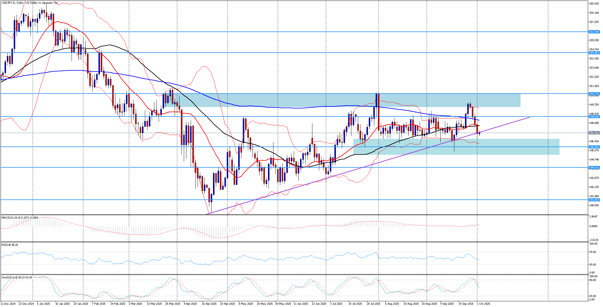 Měnový pár USD/JPY pokračuje v poklesu již čtvrtou obchodní seanci po sobě a po prolomení 20- a 50denních klouzavých průměrů se přiblížil k hranici 147,00. Jen minulý týden přitom dosáhl dvouměsíčního maxima poblíž 150,00. V širším horizontu se kurz i nadále pohybuje v konsolidačním pásmu 146,00–150,00, ve kterém se drží od začátku července. Na trh doléhá kombinace fundamentů: nejistota vyvolaná uzavřením americké vlády oslabuje dolar, zatímco zveřejněné shrnutí názorů z posledního zasedání Bank of Japan naznačilo rostoucí ochotu zvýšit úrokové sazby, což podporuje poptávku po jenu. Technický obrázek potvrzuje medvědí momentum. RSI klesl pod neutrální hladinu 50 a směřuje dolů, zatímco stochastický oscilátor se nachází hluboko pod svou signální linií a blíží se do přeprodané oblasti. Zřetelné je i to, že kurz během pouhých dvou dní spadl pod 20-, 50- i 200denní SMA, což zvyšuje pravděpodobnost pokračujícího poklesu. Pokud by tlak pokračoval, klíčová podpora se nachází v pásmu 146,00–146,50, kde se protínají 100denní SMA, dolní linie Bollingerových pásem a vzestupná trendová linie od dubnového minima. Další bariéra se nachází kolem 145,00, která v polovině září fungovala jako pevný základ. Naopak, pokud by došlo k politickému průlomu v podobě dohody o dočasném financování americké vlády, mohl by USD/JPY získat zpět část ztrát. V tom případě by první výzvou bylo znovuzískání 20- a 50denních SMA, poté 200denní SMA kolem 148,10. Nad tímto pásmem by opět přišla ke slovu silná rezistence na 150,00. Současný výhled proto zůstává nakloněn jenu, přičemž investoři sledují, zda se USD/JPY udrží nad 146,00, nebo zda trh začne testovat hlubší podpory.