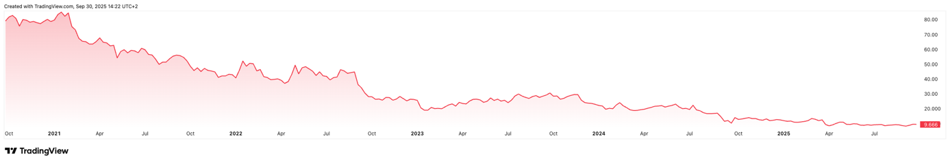 Vývoj ceny akcií Ubisoftu za posledních 5 let