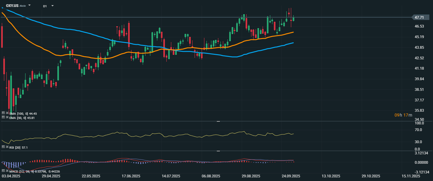 Akcie Occidental Petroleum se obchodují na úrovni 47,71 USD. Cena se pohybuje nad EMA 50 (45,81 USD) i nad SMA 100 (44,45 USD), což potvrzuje stabilní růstové momentum. RSI dosahuje hodnoty 57,1, tedy je v neutrálním pásmu se sklonem k býčímu nastavení, což ukazuje na prostor pro pokračování růstu bez rizika překoupenosti. MACD zůstává nad nulou i nad signální linií, histogram ukazuje na pozitivní momentum.