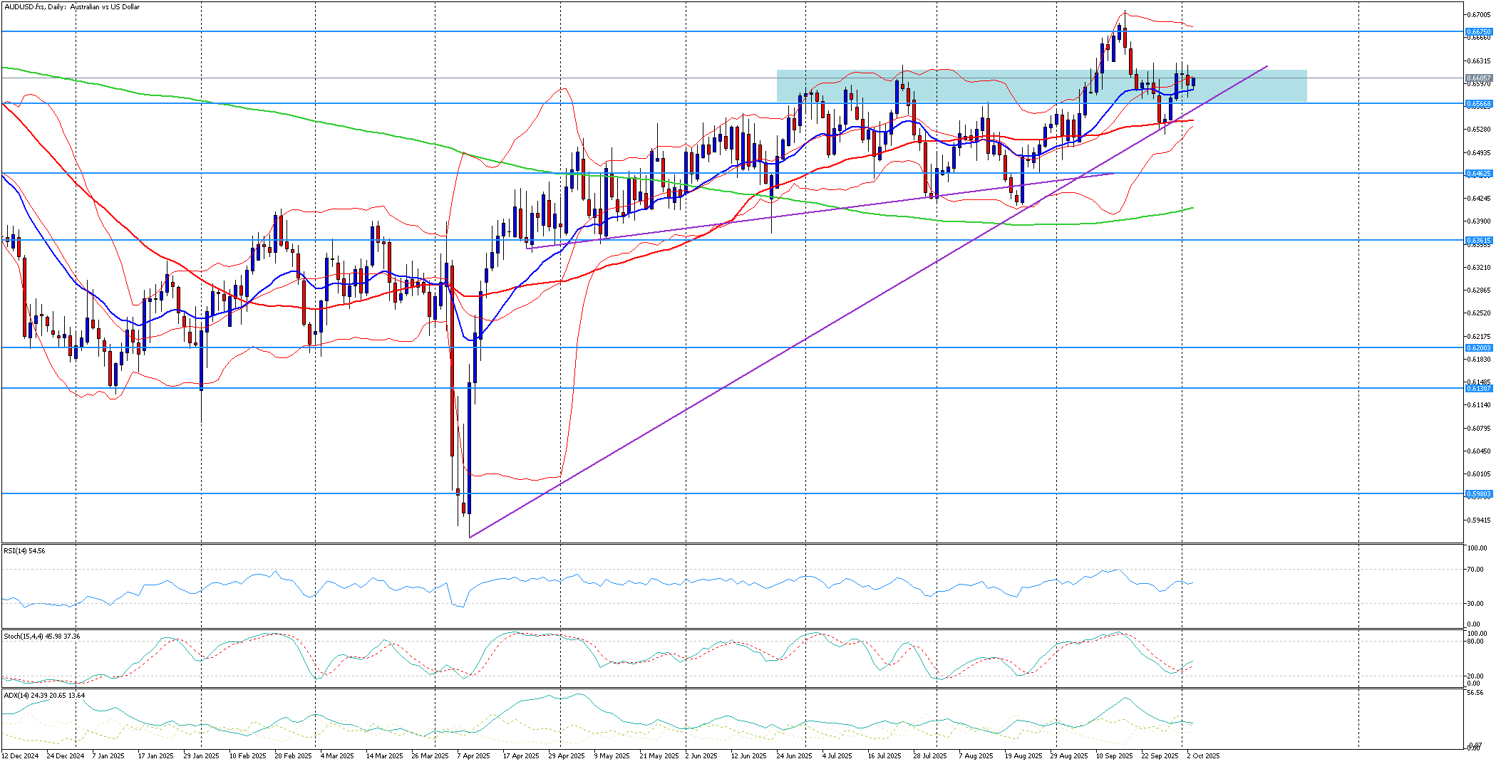 Australský dolar vůči americkému pokračuje v posilování a přidal pátou zelenou svíčku v řadě poté, co se odrazil od 100denního SMA. Růst je však méně dynamický, protože investoři vstřebávají dopady uzavření americké federální vlády, které nadále působí na tržní sentiment. Na grafu se formuje rozšiřující se klín, v jehož středu se AUD/USD aktuálně pohybuje. Přestože směr průlomu z této struktury bývá obtížně předvídatelný, historicky má častěji medvědí vyústění. Zatím ale technické indikátory podporují pokračování růstu: ADX ukazuje na mírný vzestupný trend, RSI se drží nad neutrální hranicí 50 a stochastický oscilátor se odrazil vzhůru a překročil svou signální linii. Pokud by se mu nepodařilo udržet tento průlom, mohlo by to být naopak silným medvědím varováním. Na straně rezistencí se nejbližší překážka nachází u minima z července 2022, těsně pod ročním maximem 0,6706. Úspěšný průlom by mohl otevřít cestu k 0,6721 a nakonec i k maximu z listopadu 2022 na 0,6795. Medvědi však zůstávají ve hře a budou chtít růst zastavit. Pokud by se AUD/USD propadl pod klíčové pásmo 0,6522–0,6548, kde se nachází 50- i 100denní SMA, mohl by následně otestovat podporu v zóně 0,6427–0,6458. Současný vývoj tak ukazuje na krátkodobý býčí trend, ale zároveň varuje před možností obratu, pokud se rozšiřující klín naplní ve prospěch prodejců.