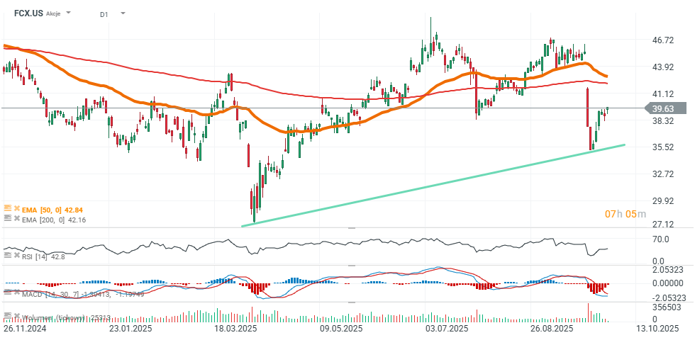 Freeport-McMoRan (FCX.US): Akcie se pokoušejí vrátit do uptrendu, když vytvořily V-obrátku z nedávného cenového dna poblíž 32 USD.