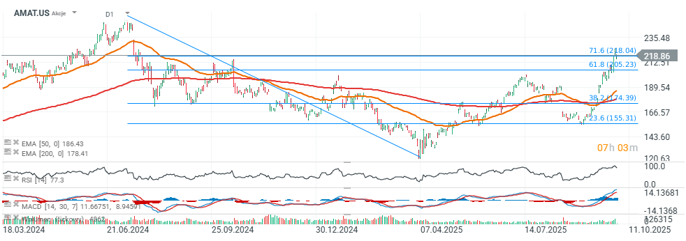 Applied Materials (AMAT.US): Akcie ustoupily poté, co dosáhly 71,6% Fibonacci retracementu růstu z června 2024. První významná podpora v korekčním scénáři leží kolem 205 USD, definovaná předchozími cenovými reakcemi a 61,8% Fibonacci retracementem.
