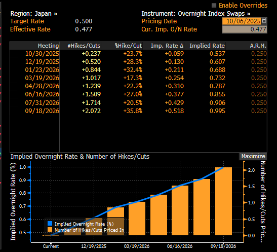 Trhy interpretovaly její vítězství jako jasný signál pro-růstové a akomodativní politiky. Program Takaichi požaduje zvýšení veřejných investic v klíčových odvětvích, jako je obrana, polovodiče a umělá inteligence, spolu s daňovými úlevami pro domácnosti a podniky. Podporuje úzkou spolupráci s BoJ s cílem udržet expanzivní prostředí namísto zpřísnění finančních podmínek. Tento postoj je v rozporu s dřívějšími očekáváními, že BoJ by mohla do konce roku 2025 opět zvýšit sazby. Obchodníci od té doby výrazně snížili sázky na krátkodobé zvýšení sazeb, což vedlo k poklesu výnosů krátkodobých dluhopisů, i když výnosy dlouhodobých dluhopisů vzrostly kvůli obavám z deficitu.
