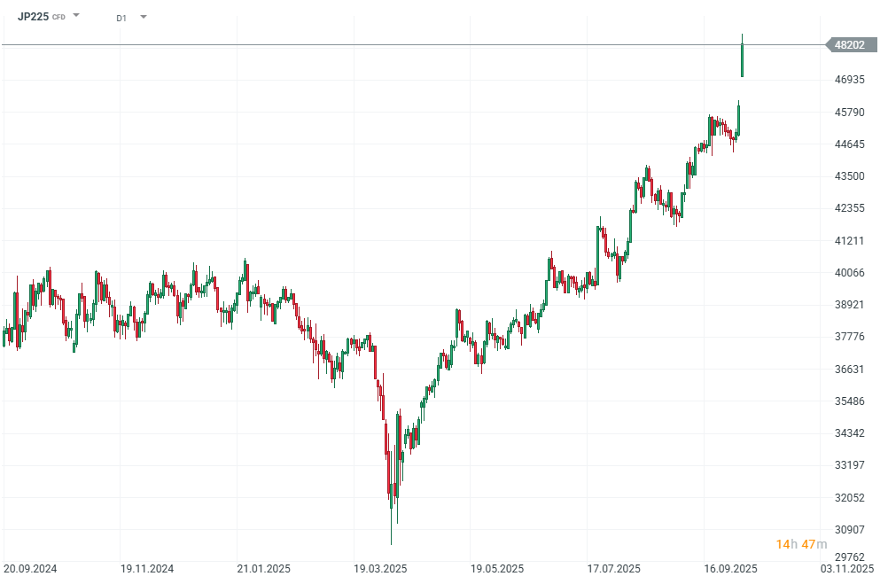 Finanční trhy reagovaly prudce a kapitál se přesunul do akcií. Index Nikkei 225 (JP225) vzrostl o 4,60 % na rekordních 48 100 bodů, a to zejména díky technologickým, těžkoprůmyslovým a realitním akciím, které těží z příznivých úvěrových podmínek.