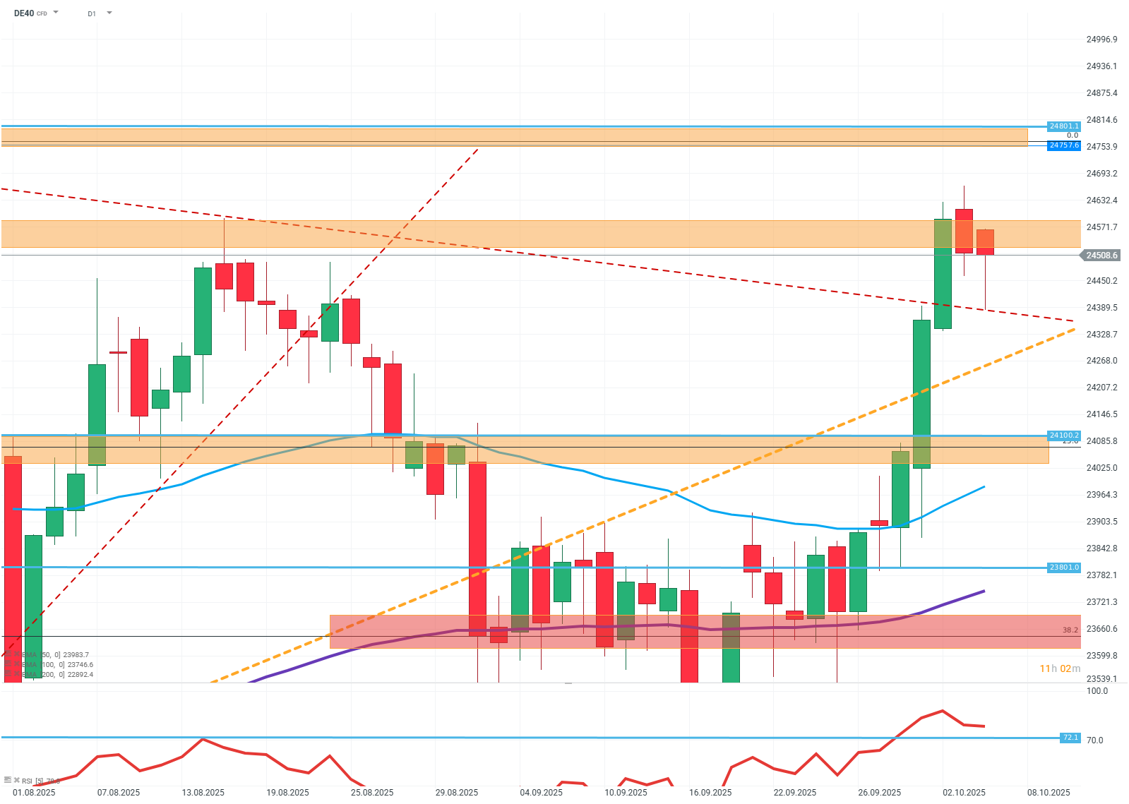 Včerejší rozhodnutí FEDu přineslo do dnešního obchodování v Evropě optimismus. Hlavní indexy, včetně DAX a Euro Stoxx 50, rostou o něco více než 1 %. Trh nahoru táhnou technologické a oděvní společnosti, které těží ze zlepšených predikcí, solidních výsledků z předchozích dnů a očekávání zlepšeného spotřebitelského sentimentu díky nižším úrokovým sazbám v USA. Kontrakty DE40, FRA40 a AUT20 rostou o více než 1 %. -
