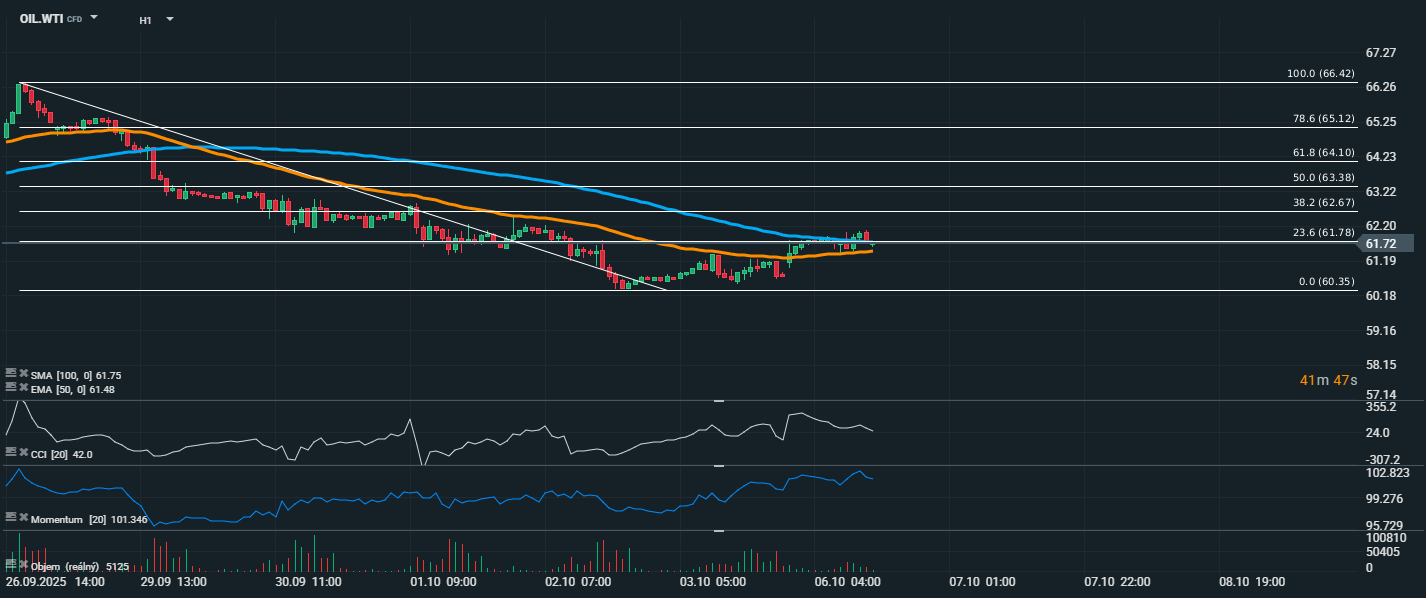 Z technického pohledu je nyní klíčové, zda cena udrží supportní pásmo kolem 61,5 – 61,75 USD (oblast klouzavých průměrů), protože jeho proražení by mohlo vést k opětovnému testování 60,35 USD, což je předchozí lokální minimum.