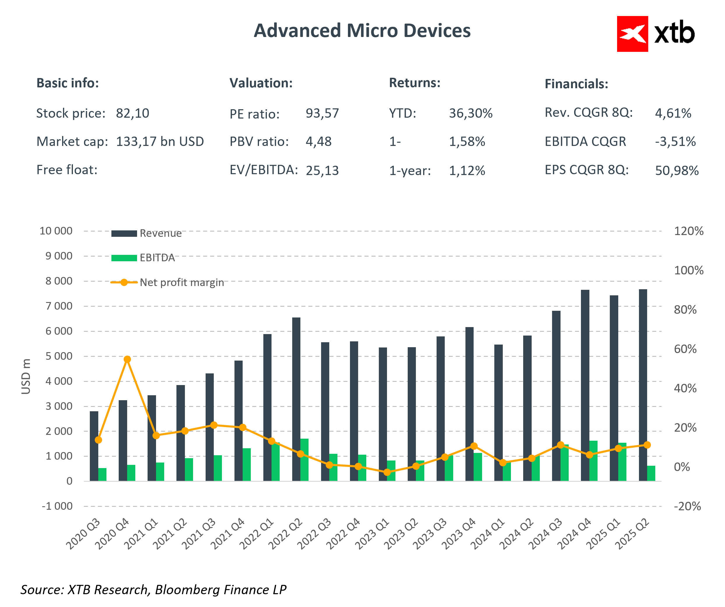 Výsledky společnosti Advanced Micro Devices (AMD.US) za 2. čtvrtletí dokázaly překonat prognózu Wall Street, ale nestačilo to na to, aby se dnes staly ochotnějším kupcem. Americký akciový trh je pod tlakem včerejšího rozhodnutí ratingové agentury Fitch Ratings, což podporuje vybírání zisků. Společnost zdůraznila, že výsledky byly pozitivně ovlivněny zejména vyššími prodeji procesorů EPYC a Ryzen 7000, a generální ředitelka AMD Lisa Liu poukázala na sedminásobně vyšší angažovanost ve vývoji umělé inteligence v souvislosti se zájmem o AMD Instinct. Celkově však zpráva AMD nepřekvapivě potvrdila zpomalení v sektoru počítačových čipů. Výsledky potvrzují výrazné zpomalení v meziročním srovnání. Mírně se snížil také k/k zisk na akcii při nezměněných tržbách. Odhad tržeb pro aktuální třetí čtvrtletí dopadl pod předpoklady. -