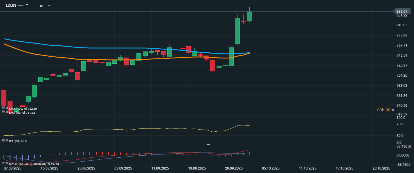 Akcie společnosti Eli Lilly zaznamenaly prudký růst, kdy během několika posledních dní vystřelily z úrovně pod 750 USD až na aktuálních 839,67 USD. Tento cenový skok byl doprovázen silnou býčí svící, která prolomila obě klouzavé průměry – EMA 50 (751,32 USD) i SMA 100 (752,20 USD) – a jednoznačně potvrzuje návrat kupců do trhu. RSI dosahuje hodnoty 66,8, což značí silný, ale zatím nepřekoupený trh. Je zde prostor pro další růst, ačkoli v následujících dnech nelze vyloučit krátkodobou konsolidaci. MACD zároveň vykazuje výrazné býčí překřížení, které potvrzuje zrychlující pozitivní momentum.