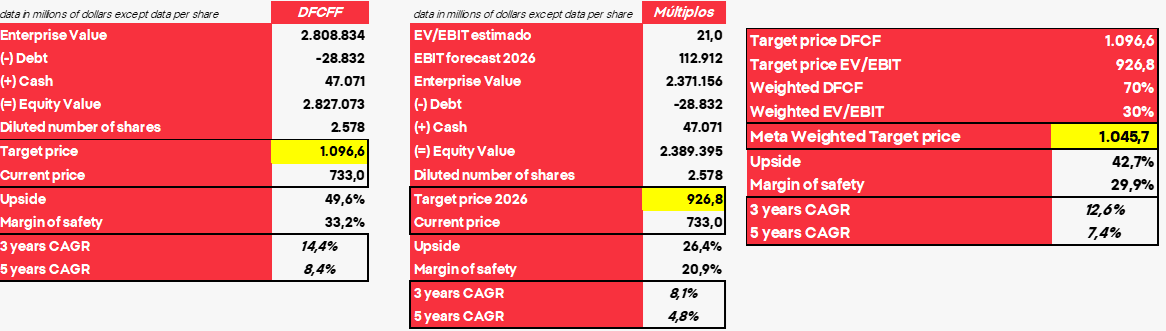 - Konečné ocenění nám dává cílovou cenu pro akcie Meta ve výši 1 045,7 USD, což představuje potenciální růst o něco přes 40 %.