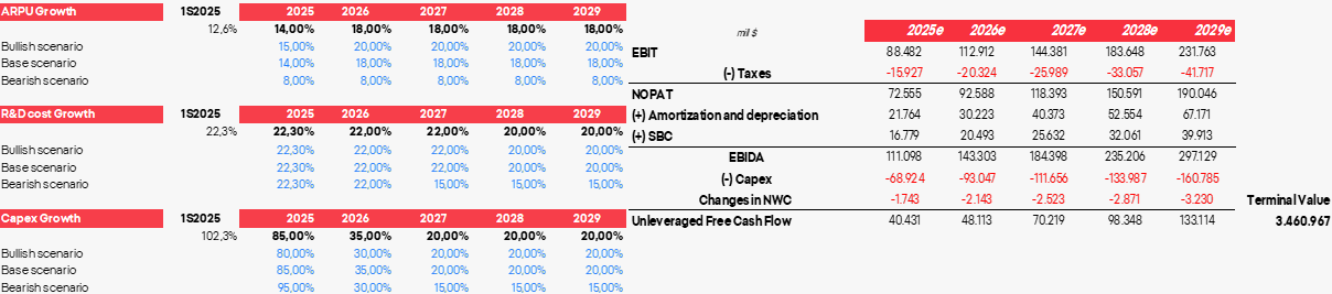 Pro účely ocenění jsme vytvořili tři scénáře založené na třech klíčových proměnných: ARPU (průměrný příjem na uživatele), výdaje na výzkum a vývoj (R&D) a kapitálové výdaje (capex).