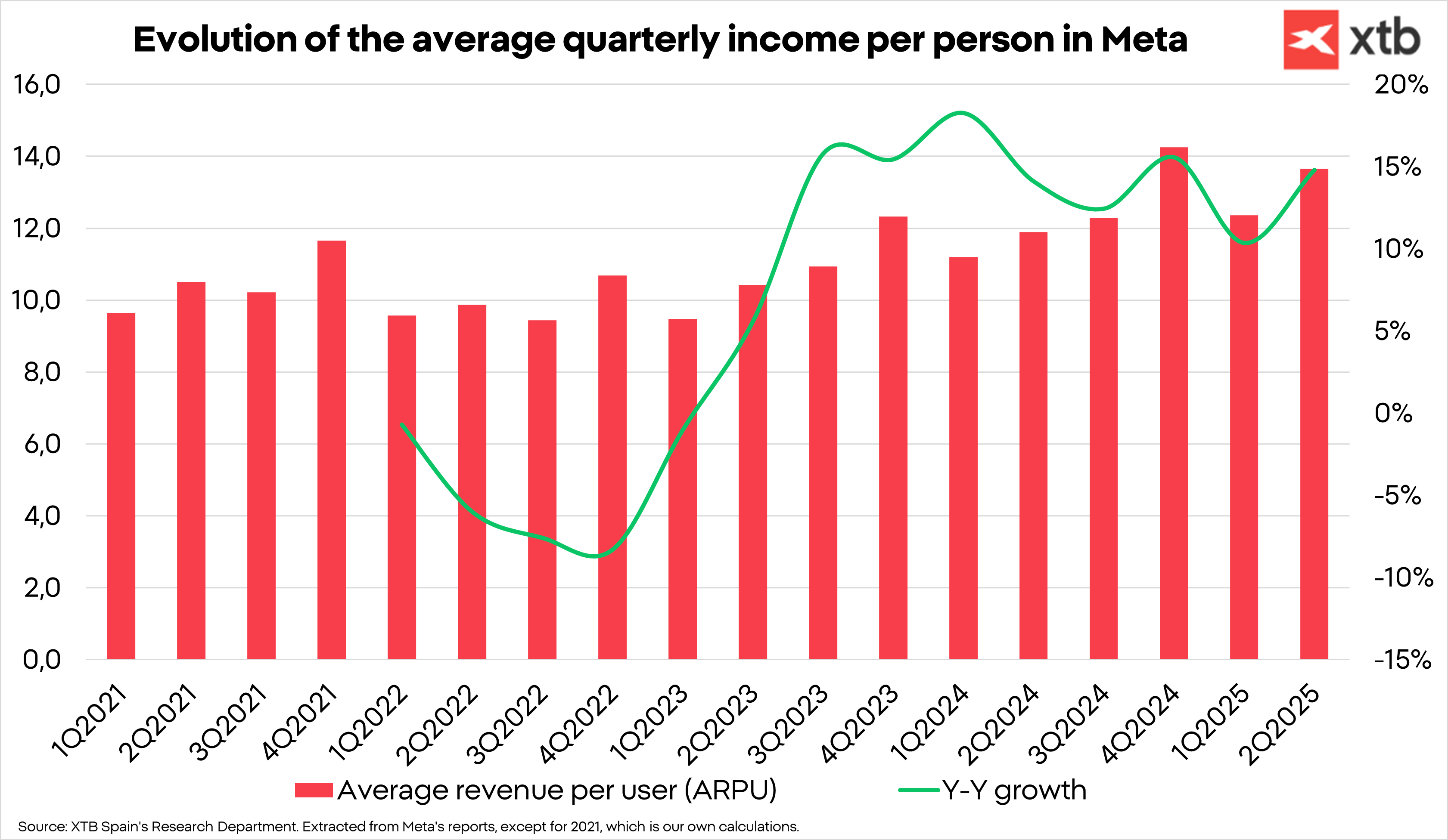 ARPU (průměrný příjem na uživatele) napříč platformami Meta nadále mezičtvrtletně roste a ve 2. čtvrtletí 2025 zaznamenal oživení.