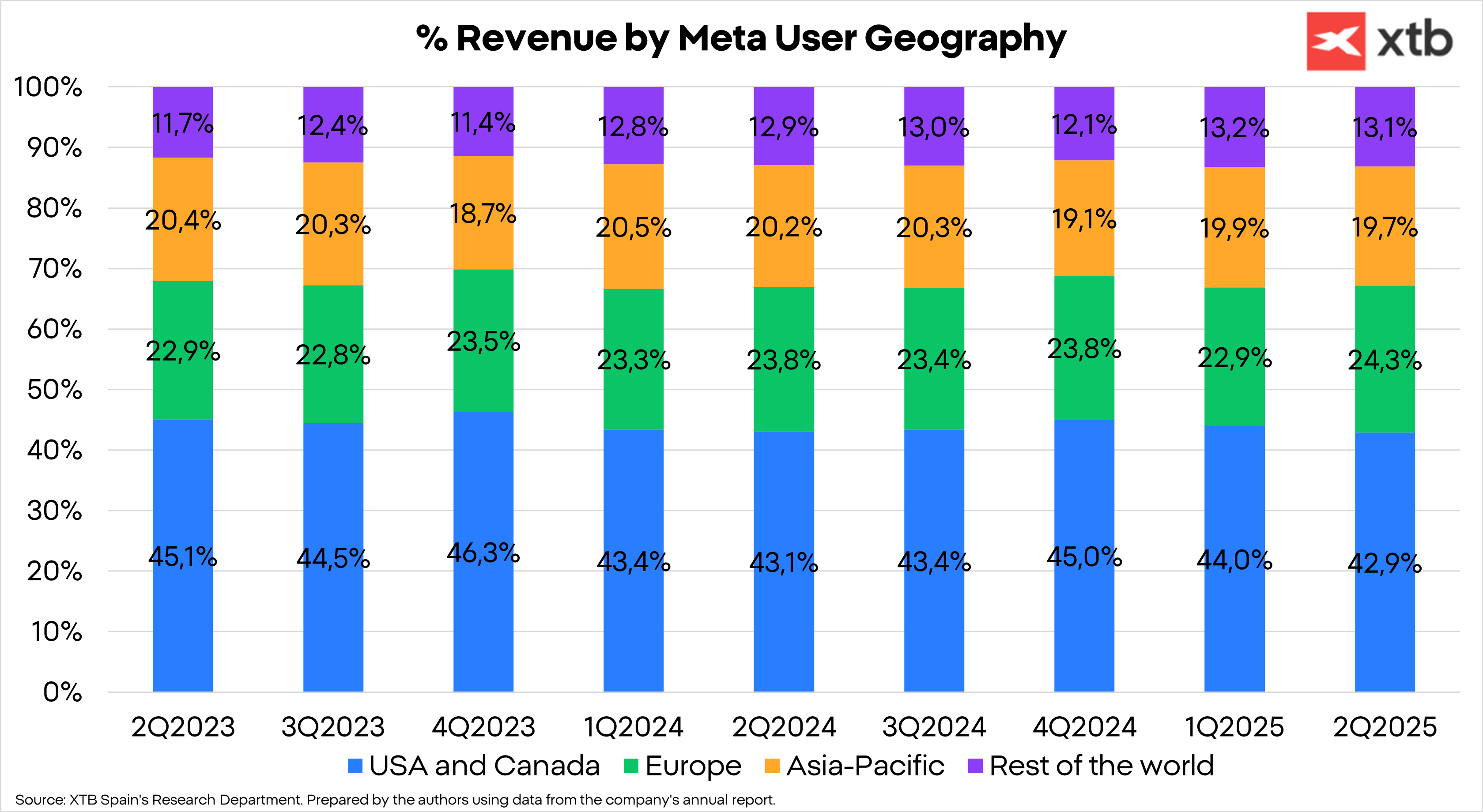 Z geografického hlediska zůstávají Spojené státy a Kanada hlavním zdrojem příjmů Meta, ačkoli regiony jako Evropa a zbytek světa získávají podíl díky rychlejšímu růstu tržeb v posledních letech.