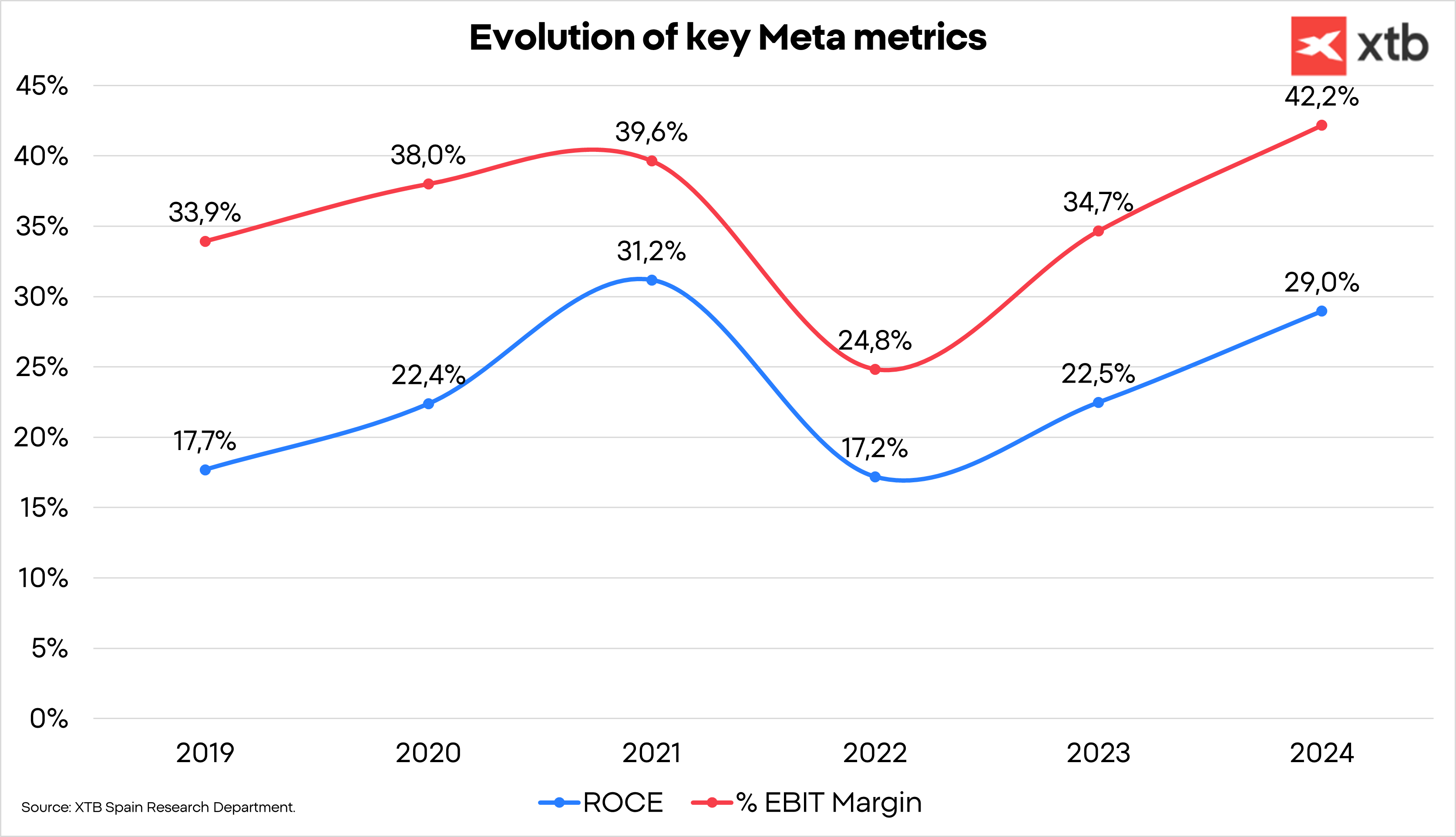 Meta má dvě klíčové konkurenční výhody, které jí umožňují dosahovat vysokých marží a zároveň investovat do zatím neziskových projektů díky silné generaci hotovosti z hlavního byznysu: