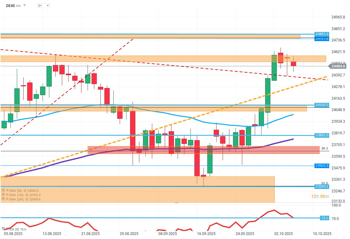 Evropská seance nezačíná příliš optimisticky. Hlavní indexy starého kontinentu otevírají v záporných číslech a nálada investorů zůstává jasně opatrná. Stále je zatěžuje politická nejistota ve Francii, kde prodloužené napětí kolem vládní situace a fiskálních reforem oslabuje chuť riskovat. Navíc nové makroekonomické údaje z Německa nevyvolávají optimismus. Kontrakty DE40 a FRA40 klesly o 0,4 %.