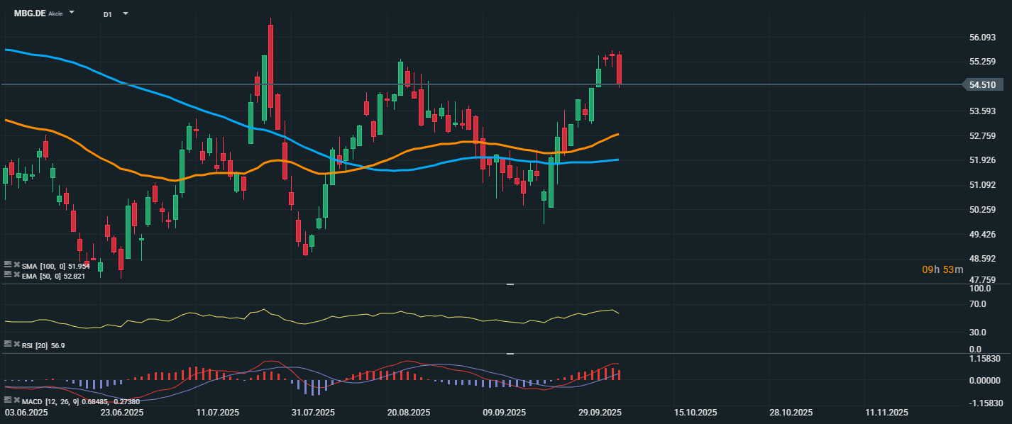 Akcie společnosti Mercedes-Benz v posledních týdnech zaznamenaly výrazný růst, ale dnes po zveřejnění poklesu globálních dodávek o 12% došlo k poklesu ceny akcií a aktuálně se obchodují na ceně 54,51 EUR. Cena se pohybuje nad klíčovými klouzavými průměry – EMA 50 (52,82 EUR) i SMA 100 (51,95 EUR). RSI se nachází na hodnotě 56,9, tedy v neutrální zóně, s mírným prostorem pro další růst bez známek překoupenosti. MACD vykazuje pozitivní histogram a signální linie směřují vzhůru, což svědčí o pokračujícím pozitivním momentu.
