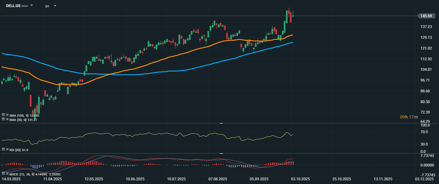 Akcie společnosti Dell Technologies se aktuálně obchodují na ceně 145,69 USD. Technický obraz je výrazně býčí – cena prorazila nad klíčové klouzavé průměry EMA 50 (131,31 USD) a SMA 100 (125,53 USD), čímž potvrdila silný růstový trend. RSI se nachází na hodnotě 61,9, tedy v pásmu mírné překoupenosti, ale stále s prostorem pro další růst, zejména pokud bude přetrvávat pozitivní fundament.