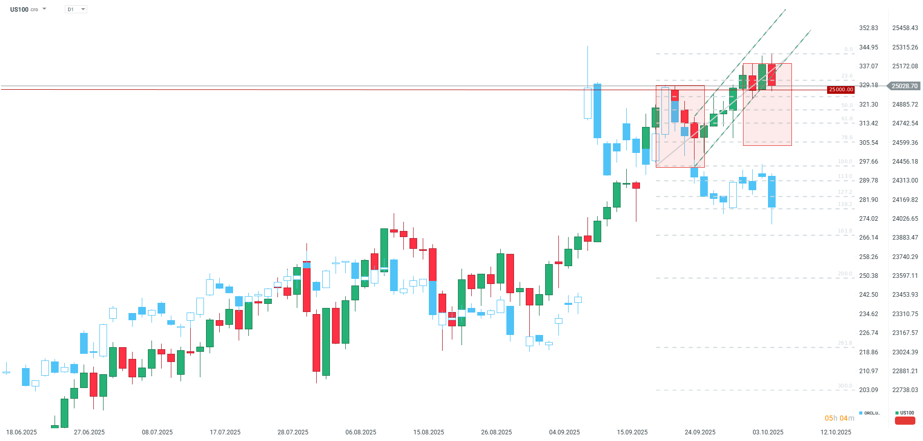 Index US100 dnes otestoval úroveň 25 000 bodů, která představuje podporu vycházející z lokálních vrcholů z 22.–23. září. Akcie Oraclu nyní umazávají část ztrát, přesto cena během dne prorazila lokální minima z 1. října a obrátila přibližně polovinu růstu ze 10. září.