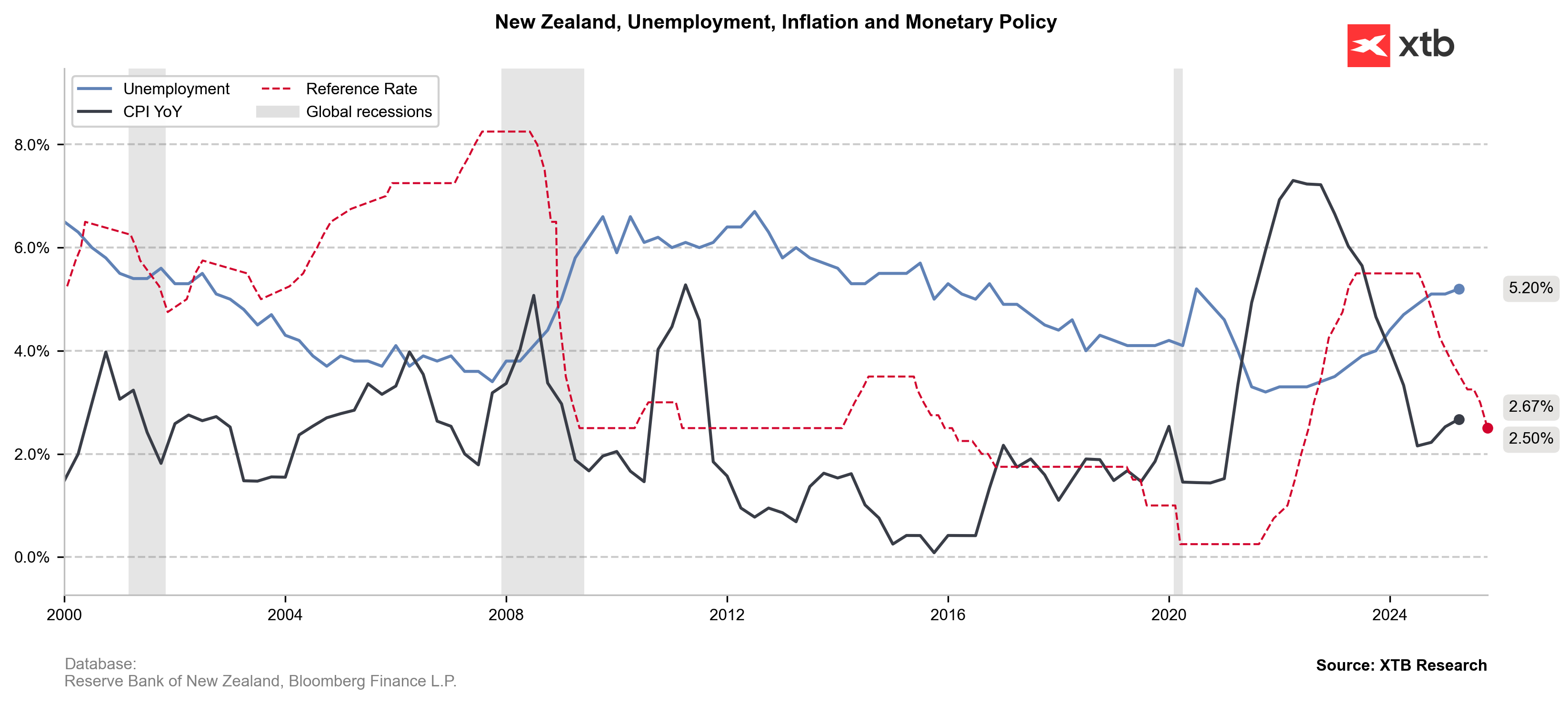Novozélandská centrální banka (RBNZ) provedla větší než očekávané snížení sazeb o 50 bazických bodů, čímž oficiální hotovostní sazba (OCR) klesla na 2,50 % v reakci na slabší ekonomický růst a rostoucí propad poptávky. Výbor poznamenal, že domácí inflační tlaky slábnou. Jádrová inflace bez regulovaných cen je v souladu s cílem, i když celková inflace CPI zůstává blízko horní hranice pásma 1–3 %. Kromě toho se inflace CPI pravděpodobně pohybovala kolem 3,0 % ve třetím čtvrtletí 2025, a to v důsledku vyšších cen potravin a regulovaných služeb. Vzhledem k jasné nadbytečné kapacitě ekonomiky a silnějšímu přenosu politiky (nižší velkoobchodní, hypoteční a korporátní úrokové sazby) banka očekává, že inflace se v první polovině roku 2026 přiblíží 2 %.