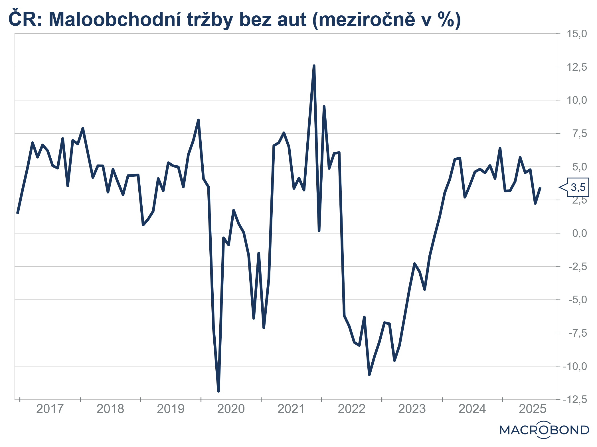 Maloobchodní tržby bez automobilů v srpnu rostly o 3,5 % meziročně oproti revidovanému růstu o 2,2 % v červenci. Trhy očekávaly růst o 3,1 % meziročně.