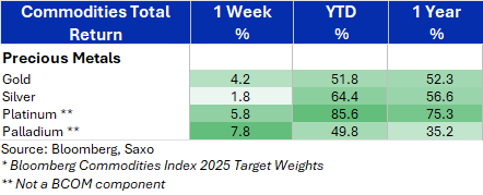 Palladium — po nadměrných investicích v automobilovém sektoru — vykazuje známky stabilizace. Jeho nárůst o 7,8 % v posledním týdnu byl nejsilnější v rámci komplexu, ačkoliv zůstává hluboko pod svými vrcholy z roku 2021.