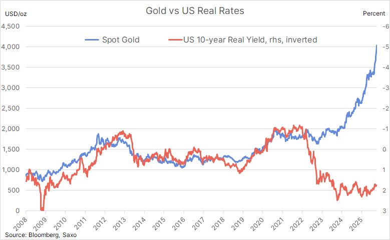Důsledkem je trh, který už nereguluje krátkodobá spekulativní kapitálová reakce na změny reálných výnosů, ale strukturální poptávka po bezpečí. Korelace, jež dříve spojovala zlato s inverzí reálných výnosů USA, výrazně slábne — což dokládá to, jak politické, fiskální a strategické faktory přebírají otěže.
