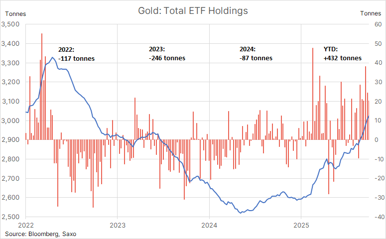 Tato eroze důvěry se obzvlášť patrně projevuje od roku 2022, kdy sankce zmrazily rezervy ruské centrální banky a Čína začala nenápadně zvyšovat své zlaté rezervy. Od té doby centrální banky přidávají do svých rezerv více než 1 000 tun zlata ročně — nejrychlejším tempem v historii — zatímco instituce i investoři s vysokým majetkem obnovují alokace směrem k fyzickému zlatu a k ETF krytých zlatem.