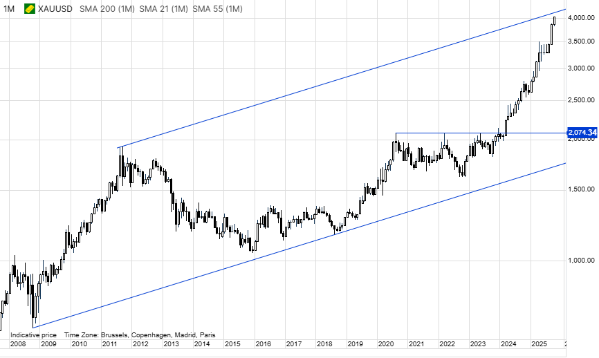 Během 17 měsíců Fed zvýšil základní sazbu o 525 bazických bodů, přesto zlato neustoupilo. Nákupy centrálních bank a čínská poptávka kompenzovaly prodej západních správců aktiv. Koncem roku 2022 opakované pokusy snížit cenu pod 1 615 USD selhaly, což vybudovalo momentum pro oživení, které vyvrcholilo v březnu 2024 průrazem nad 2 075 USD — úroveň, jež držela cenu na uzdě tři roky. Když byla tato střecha překonána, převzala tempo hybnost, podpořená návalem nových kapitálových toků ze strany institucí i retailových investorů.