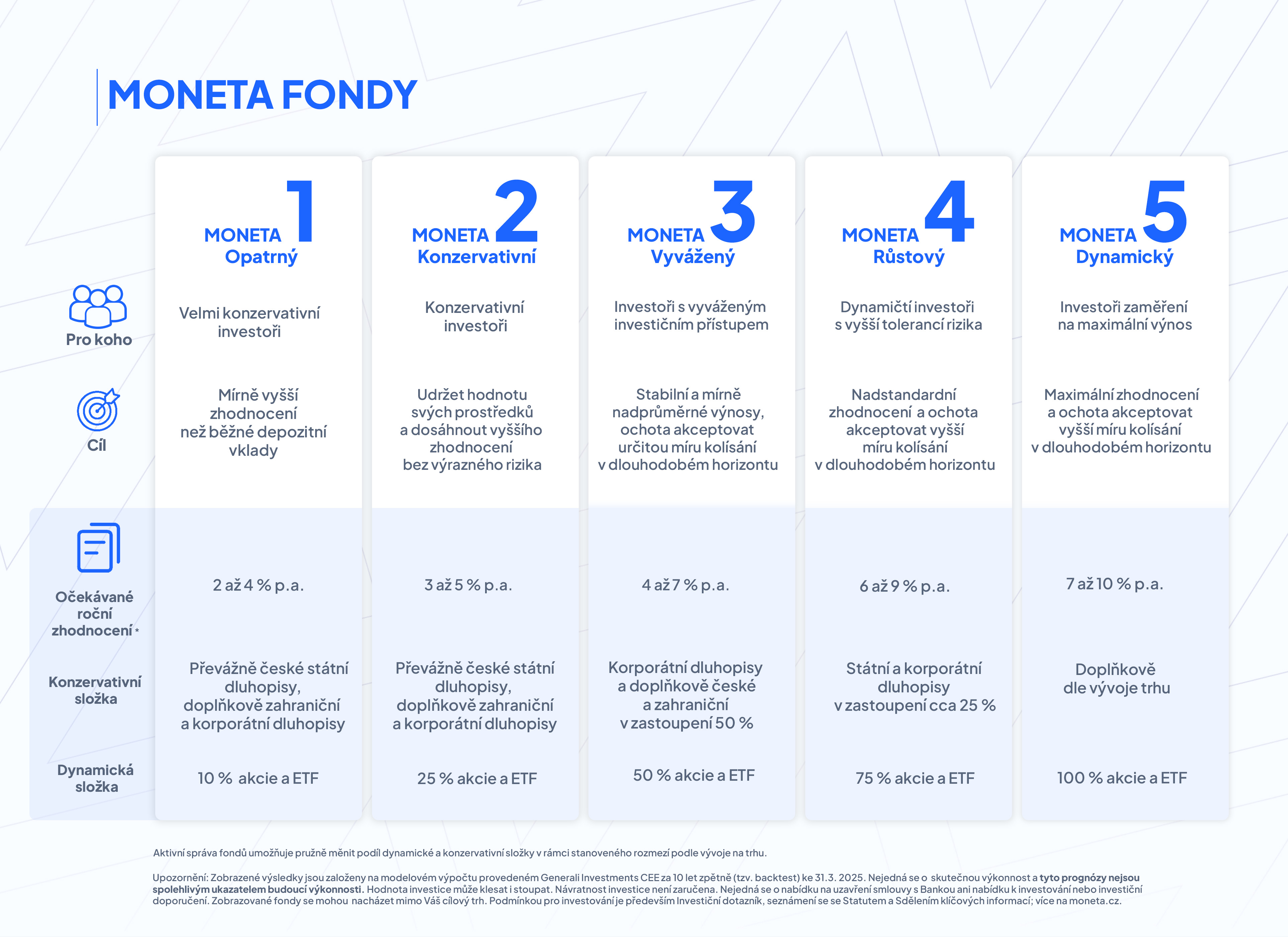 Každý z pěti MONETA fondů nabízí komplexní investiční řešení přizpůsobené různým rizikovým profilům – od konzervativního až po dynamický. V rámci jedné strategie kombinuje různá aktiva, jako jsou akcie, dluhopisy, ETF či certifikáty, a rozkládá riziko napříč sektory, regiony i typy správců. „Pro zjednodušení se dá řídit číslem fondu. MONETA fond 1 opatrný je nejméně rizikový fond, vhodný pro začínající investory, nebo pro investory s krátkým investičním horizontem. Naopak dynamický fond MONETA 5 je ideální pro investory, kteří se nebojí rizika anebo před sebou mají dlouhý investiční horizont,“ představuje nové fondy Jiří Fait, manažer investic MONETA Money Bank. Jak navíc dodává, minimální částka k investování v rámci MONETA fondů je 300 korun.