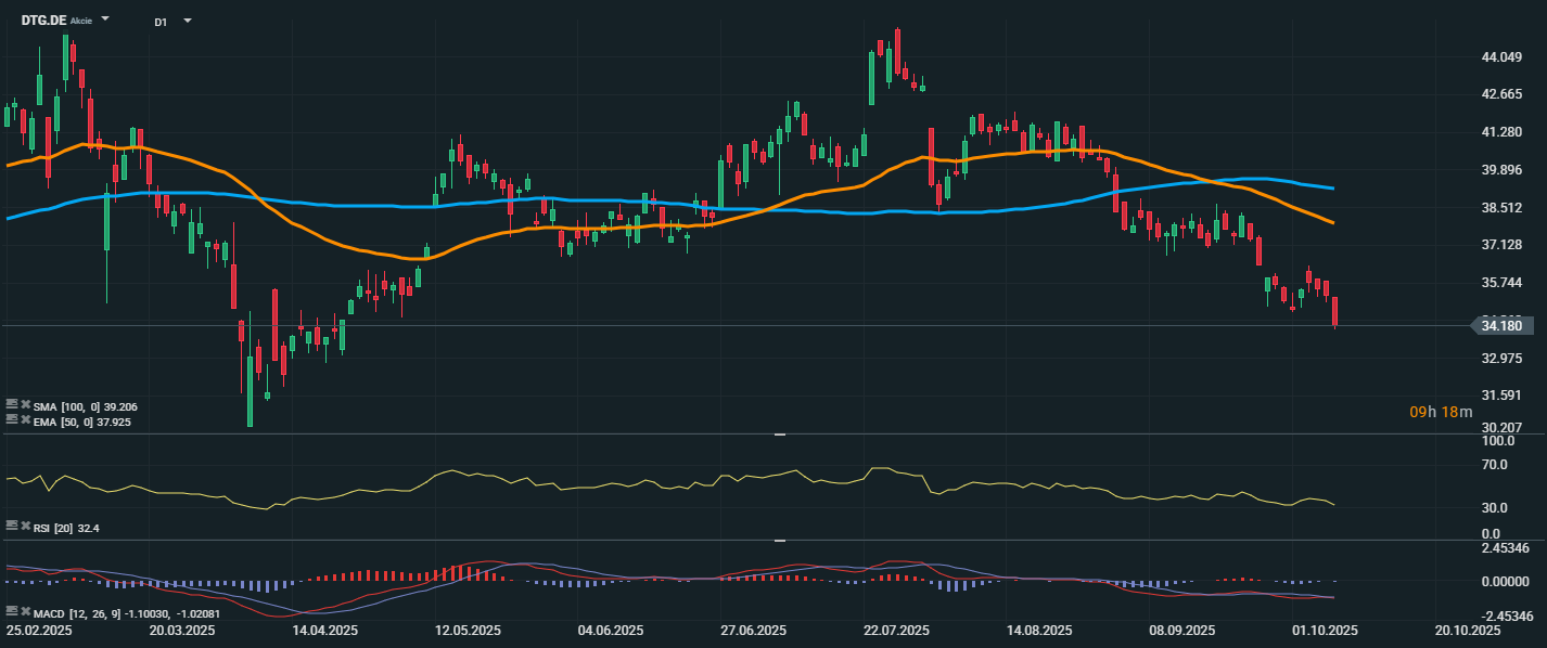 Akcie Daimler Truck se aktuálně obchodují na úrovni 34,18 EUR a pokračující v sestupném trendu. Cena se jasně drží pod klouzavými průměry – EMA 50 (37,92 EUR) i SMA 100 (39,20 EUR), což potvrzuje technicky medvědí nastavení trhu. RSI kleslo na 32,4 bodu, tedy těsně nad hranicí přeprodanosti, což může signalizovat možnost krátkodobého odrazu – zvláště pokud by došlo k pozitivní fundamentální zprávě. Avšak zatím nevidíme žádný obratový signál.