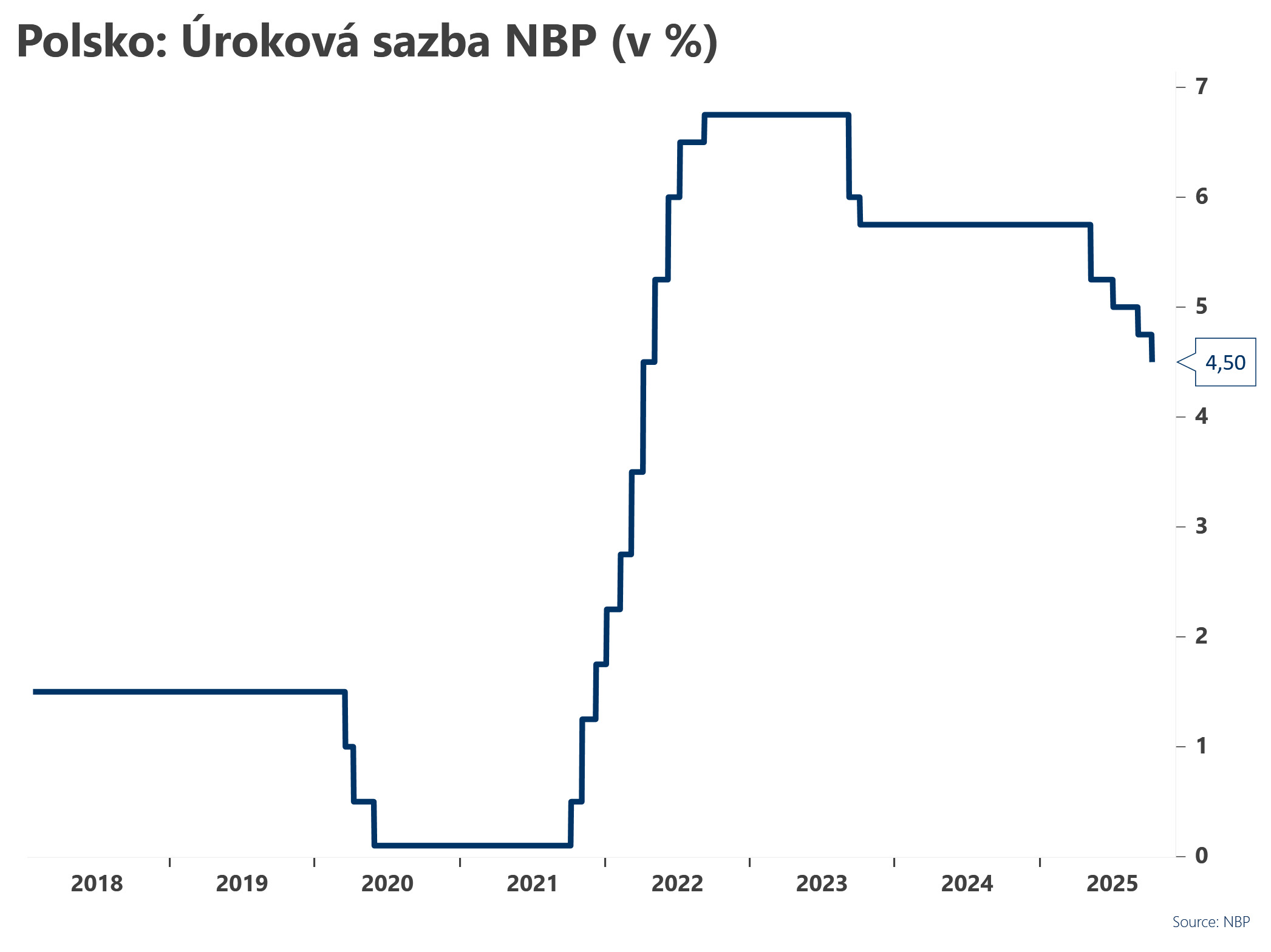 Polská centrální banka na svém dnešním zasedání snížila svoji úrokovou sazbu o 25bps na 4,50 %.