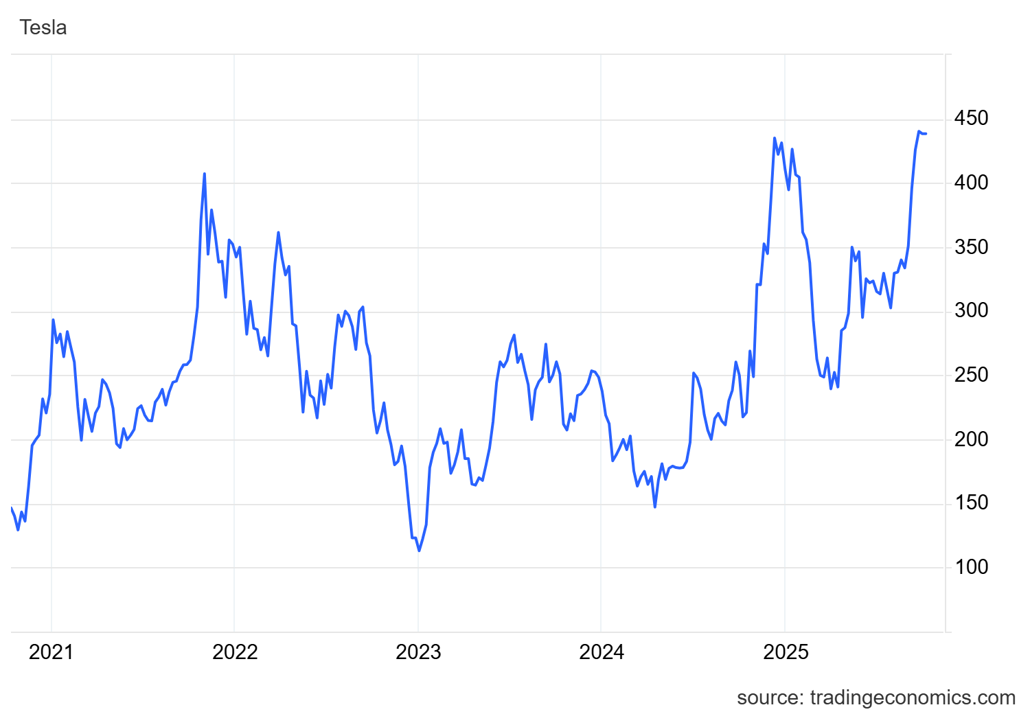 Investoři se po zveřejnění těchto fundamentálních údajů tradičně zaměřili také na reakci ceny akcií Tesly. Během daného obchodního dne došlo k poklesu o 5,11 %, ale je důležité vnímat situaci komplexněji. Za třetí čtvrtletí 2025 došlo k růstu o 40 %, přičemž od začátku roku se hodnota Tesly zvýšila o 14 %. Výrobce tak po slabém začátku roku znovu získává důvěru investorů, ale platnější potvrzení dlouhodobějšího býčího sentimentu by mohlo přijít po čtvrtletních výsledcích – již 22. října 2025. Investoři budou pozorně sledovat, jak si vede ziskovost – zejména v kontextu rostoucích výrobních nákladů a ukončených daňových pobídek v USA.