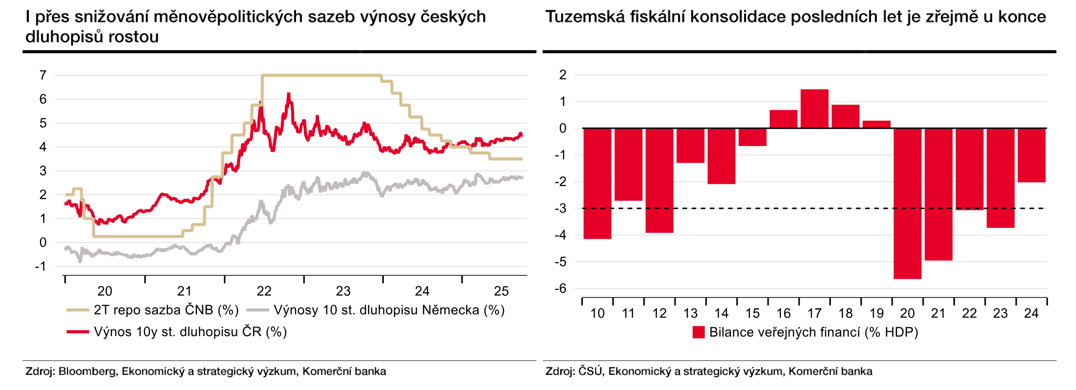 Česko je prozatím v relativně dobré výchozí pozici, pokud jde o zdraví veřejných financí. S dluhem ve výši 43,3 % HDP se řadí mezi třetinu nejméně zadlužených zemí EU. Deficit veřejných financí by pak letos měl skončit okolo 2 % HDP, což je bezpečně pod Maastrichtskými kritérii ve výši 3 %. I proto je nadále ratingově nejlépe hodnocenou zemí ze střední a východní Evropy. Současný rating ovšem agentury podmiňovaly další konsolidací, případně alespoň nezhoršováním kondice tuzemských veřejných financí. Obojí se ovšem nyní zdá jako krajně nepravděpodobné, když v posledních dnech od představitelů pravděpodobné nové vlády zaznívá, že meziroční navýšení schodku státního rozpočtu by v příštím roce mohlo dosáhnout více než 100 mld. korun (z letošních 241 mld. na zhruba 346 mld.). Z pohledu veřejných financí jako celku by to při předpokládaném zachování přebytkového hospodaření místních rozpočtů znamenalo zvýšení deficitu až ke 3 % HDP. Takovýto scénář zatím plně nezohledňují ani finanční trhy. Tržní konsenzus deficitu tuzemských veřejných financí je momentálně na 2,3 % pro rok 2026 a 2,1 % pro rok 2027. Dojde-li tedy k rozvolnění fiskální politiky v avizované výši, výnosy tuzemských státních dluhopisů ještě nemusí být na svém vrcholu.
