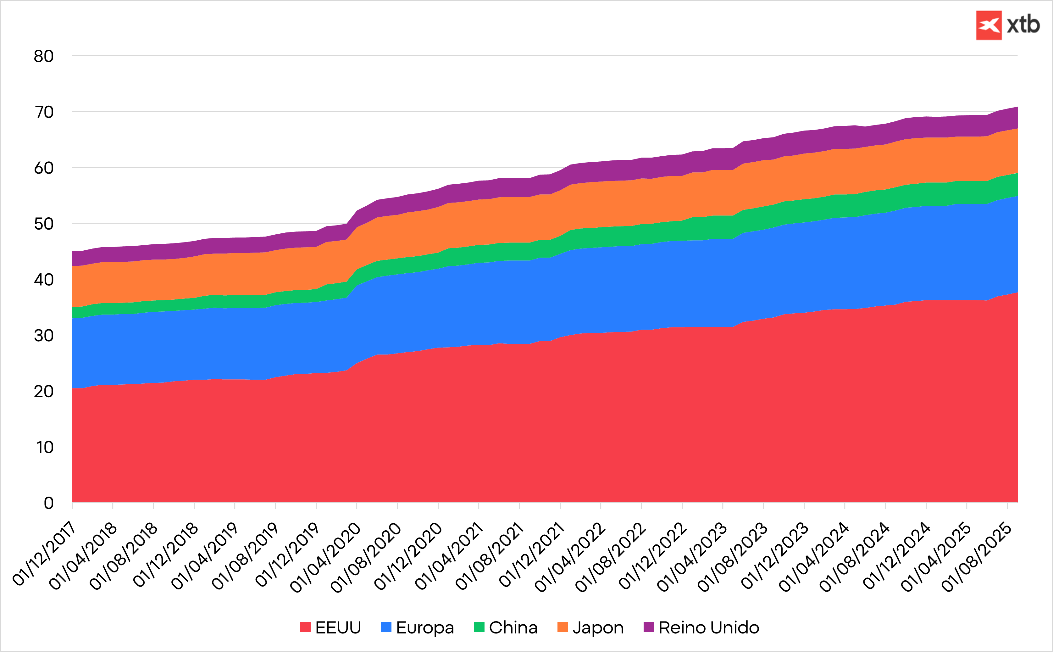 Růst dluhu v bilionech dolarů v hlavních ekonomikách. Zdroj: XTB